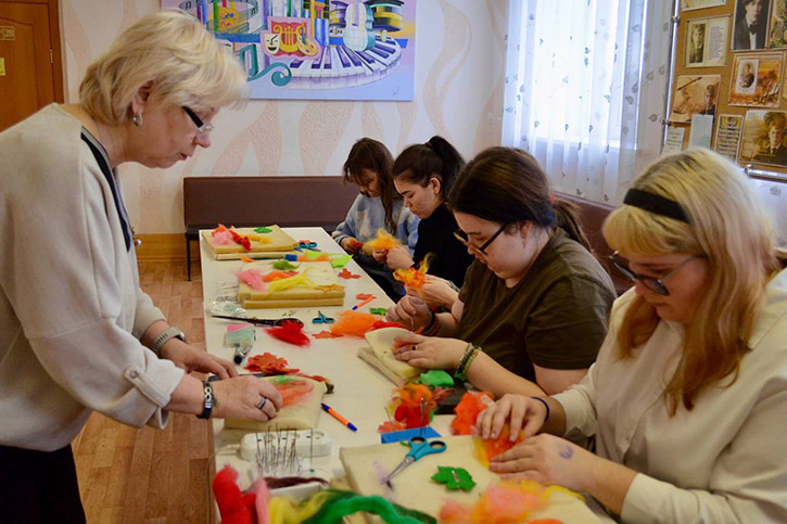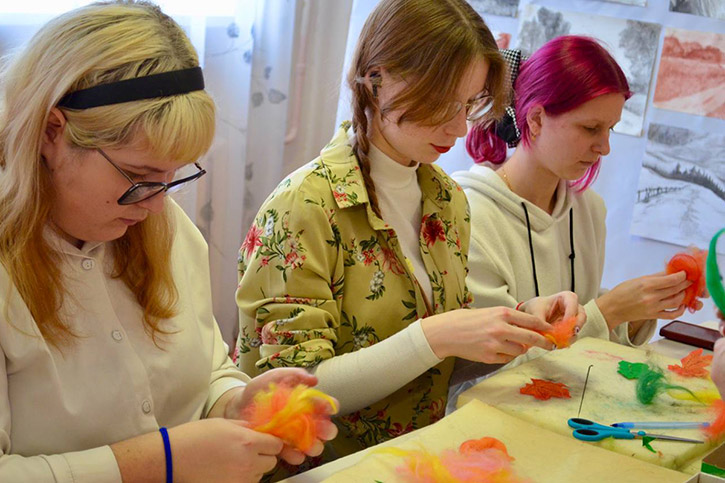 Не менее увлекательным оказался мастер-класс по валянию из шерсти "Закружилась листва золотая", проведённый В.А.Балябкиной. Студенты с энтузиазмом осваивали технику валяния, создавая из мягкой шерсти яркие осенние листья, словно сошедшие со страниц есенинских стихов. Тёплые тона, фактурные поверхности и оригинальные формы - каждая работа стала настоящим произведением искусства, наполненным осенним настроением и любовью к родной природе.