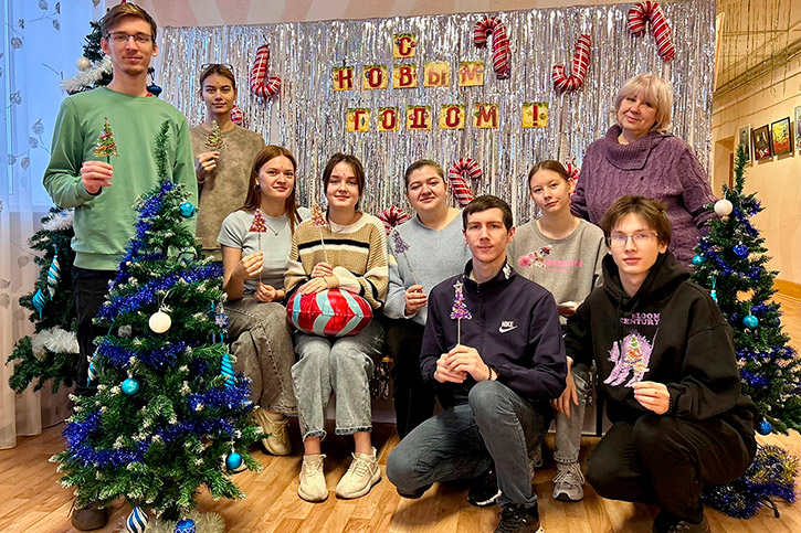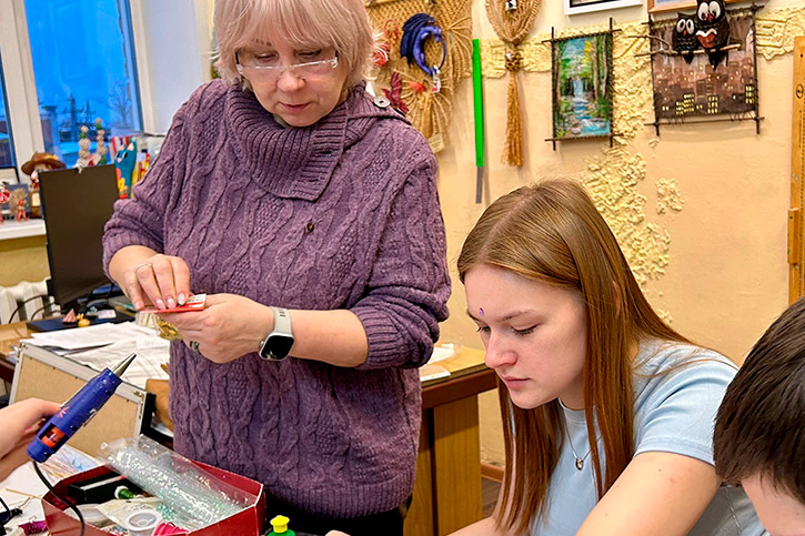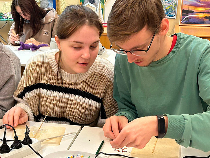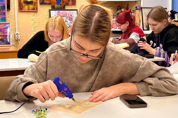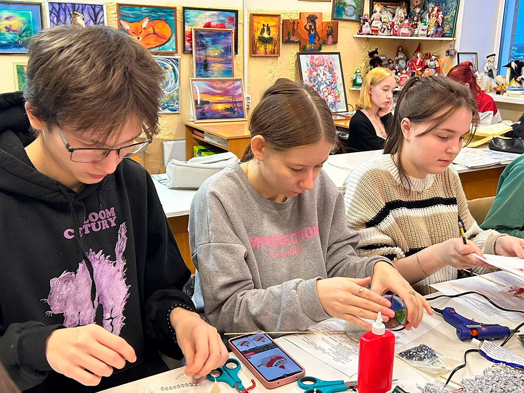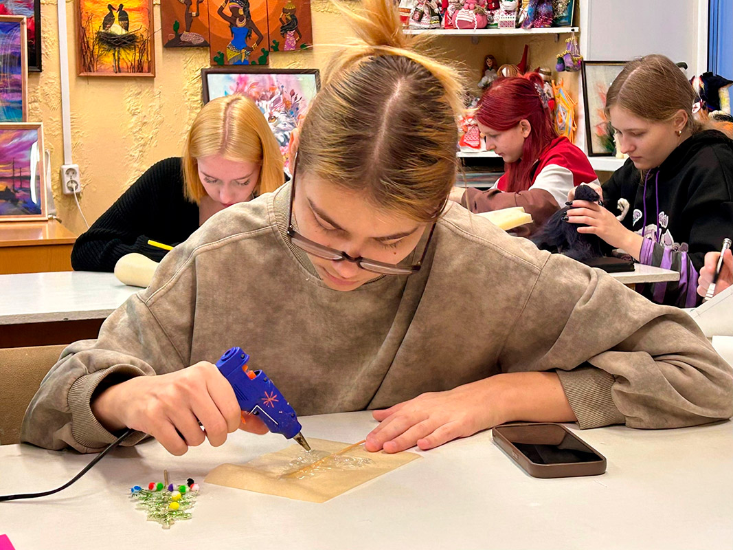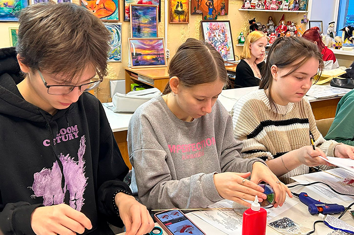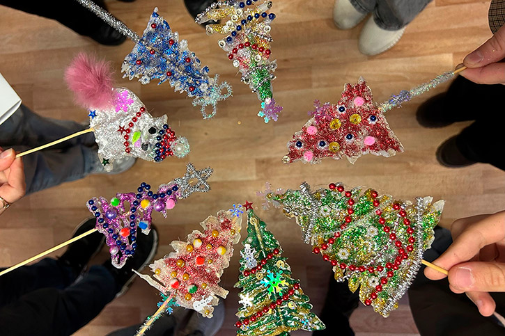 А самым увлекательным этапом стало декорирование получившихся силуэтов. Студенты активно использовали разнообразные блестящие материалы: мелкие бусины и яркие блестки, превращая свои работы в настоящие мерцающие символы праздника.