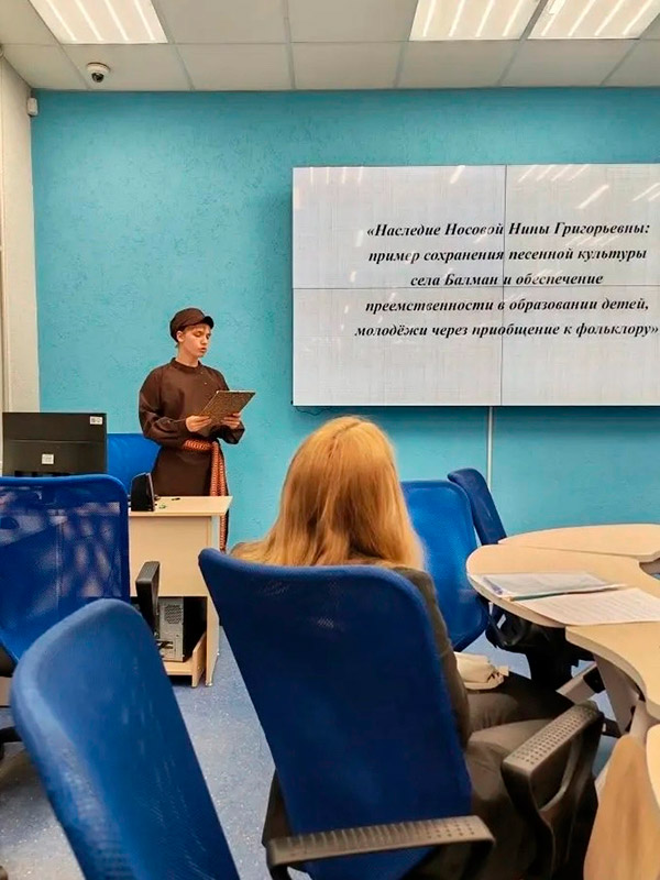 Тема его выступления - "Наследие Носовой Нины Григорьевны: пример сохранения песенной культуры села Балман и обеспечение преемственности в образовании детей, молодежи через приобщение к фольклору". Это не просто исследование, это глубокий взгляд на сохранение нашей уникальной песенной культуры и передачу ее будущим поколениям.