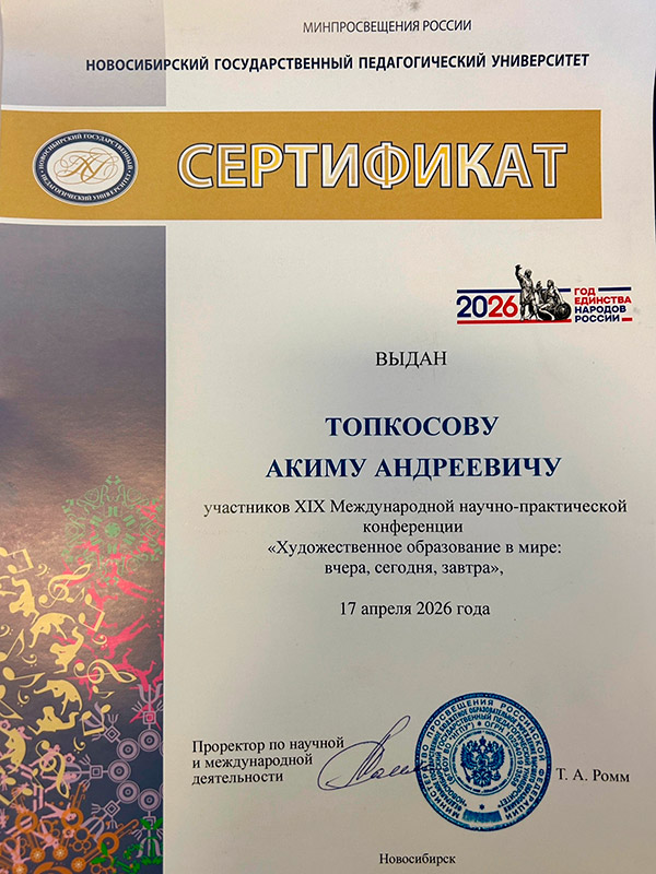 17 апреля студент 1 курса специальности "Народное художественное творчество" Аким Топкосов (руководитель - Надежда Сергеевна Тормоза) успешно представил доклад на студенческой секции XIX Международной научно-практической конференции "Художественное образование в мире: вчера, сегодня, завтра".